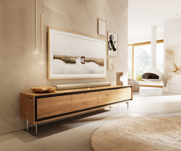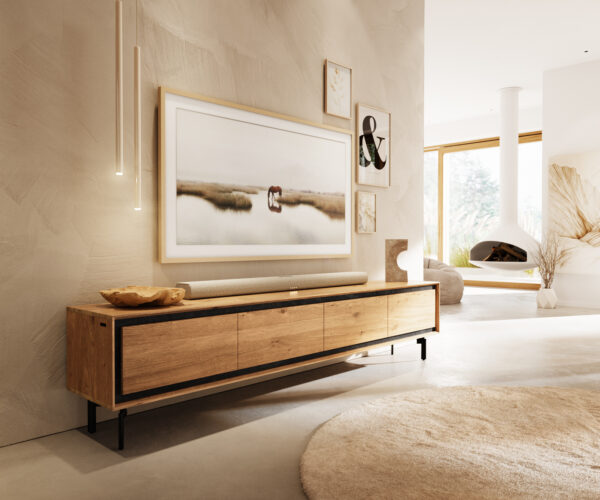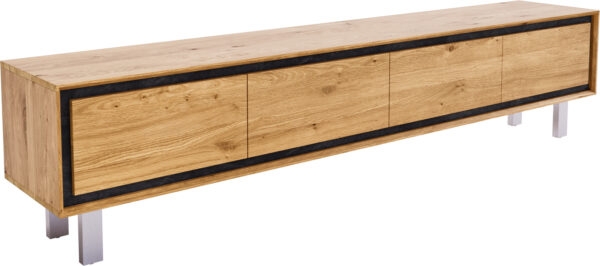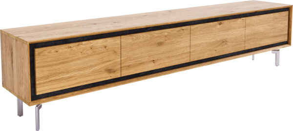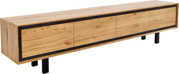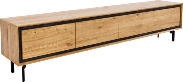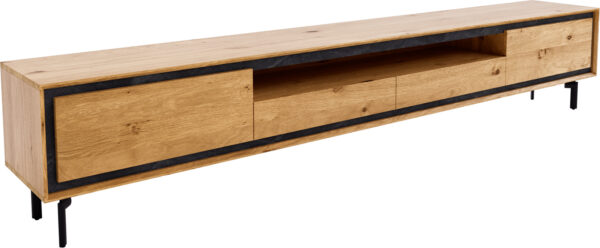 TV szekrény Stonegrace 240 cm tölgy természetes 2 ajtós 1 rekeszes 2 fiókos kőfurnér V láb fém fekete
