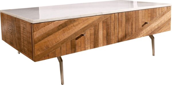 Dohányzóasztal Bahan 115x60 cm mango teak 2 fiókos fehér márvány asztallappal szögletes rozsdamentes acél lábbal