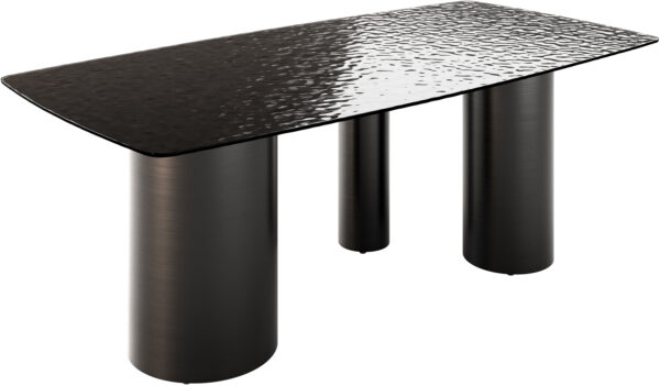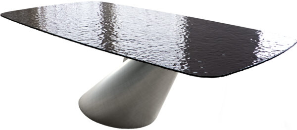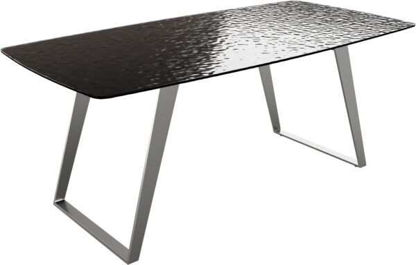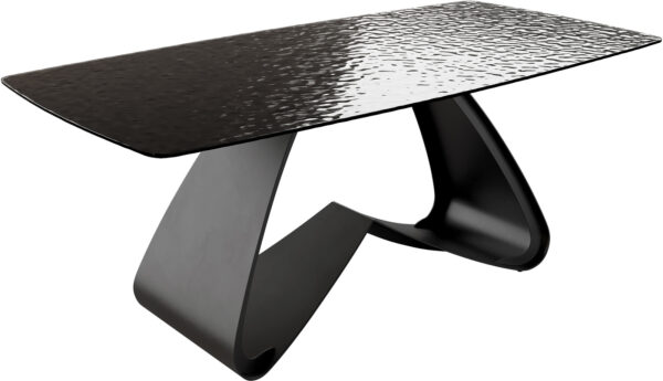 Étkezőasztal Edge hajóformájú 200x100 domborított üveg füstfekete 3D design W alakú fém láb fekete