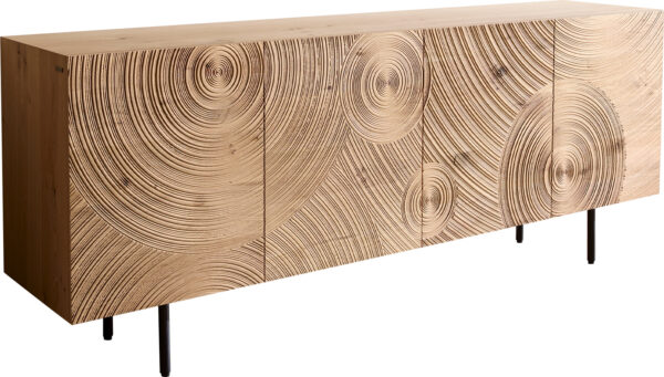 Komód Ashara 200 cm tölgy természetes 3D hatás 4 ajtós kerek fém láb fekete
