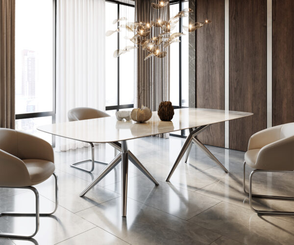 Étkezőasztal Edge hajóformájú 240x120 cm Laminam® Emperador kerámia Extra Lucidato sötétbarna Pilier fém titán effekt felület