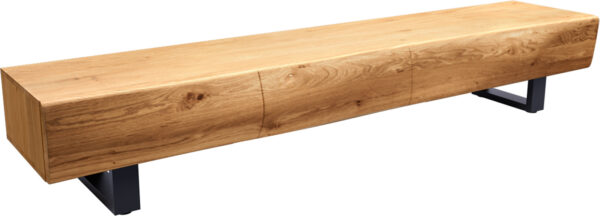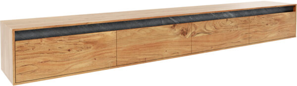 TV szekrény Solu 220 cm akác természetes 2 ajtós 4 fiókos lebegő fém láb fekete 3D előlap