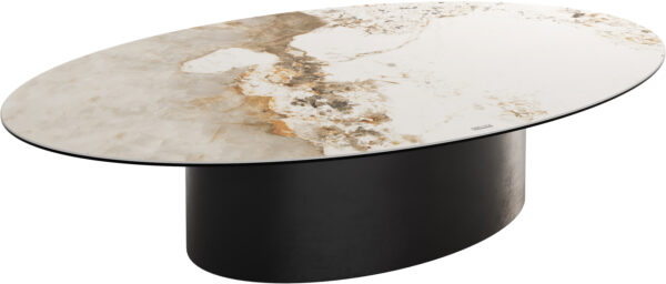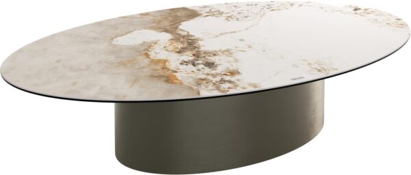 Ha egy páratlan dohányzóasztal mesterművet keresel, amely fényűzően díszíti nappalidat és mindenkit ámulatba ejt, akkor a Casilda pont neked való. A feltűnő, ovális asztallap mély, gazdag Braun Noir Desir barna színben finom erezetével és strukturált Stone felületével tiszta eleganciát sugároz. A világszerte ismert Laminam® kerámiából készült dohányzóasztal nemcsak lenyűgöző megjelenésével, hanem kiváló tulajdonságaival is elvarázsol. Ez a minőségű kerámia különösen ellenálló, könnyen ápolható, és sok éven át újszerű marad. Ez teszi a Casildát tökéletes asztallá azok számára, akik többet várnak el.