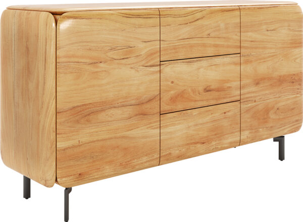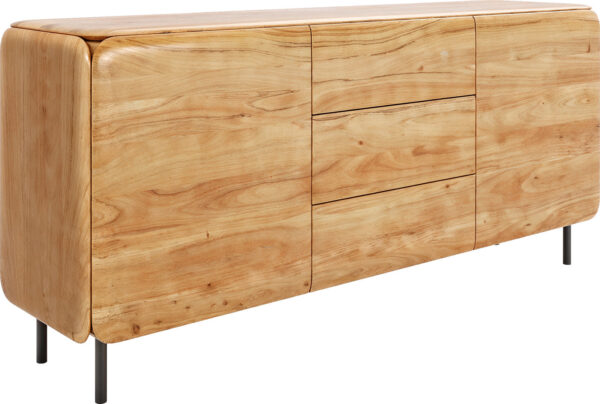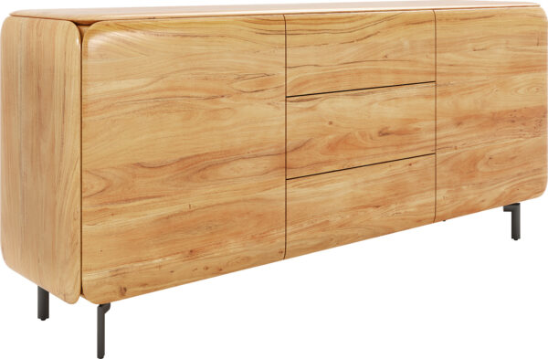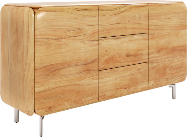 Az akácból készült komód természetes színváltozatban időtlen eleganciát hoz otthonába. Az akácfa természetes erezete meleg és hívogató légkört teremt, míg a lekerekített élek az egész komódon kerek egészet alkotnak, különösen elegáns megjelenést biztosítva. A két ajtó mögött és a három fiókban sok tárolóhely rejtőzik, amely segít rendet tartani és stílusosan szervezni a tereket.
