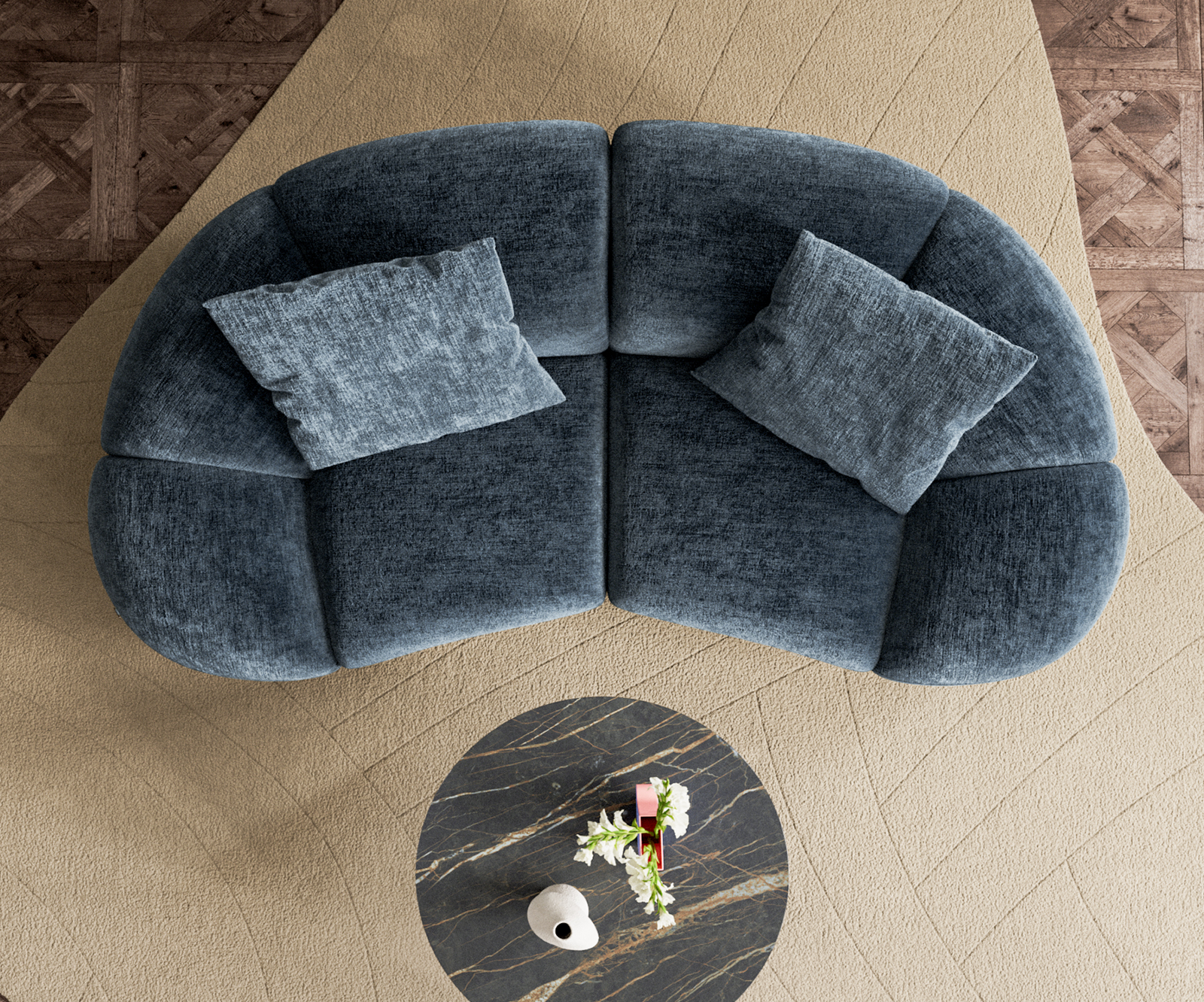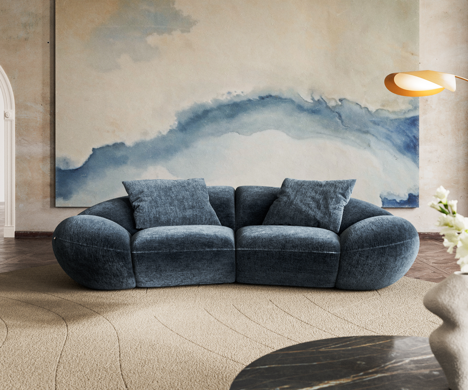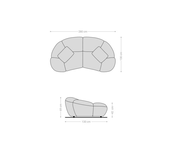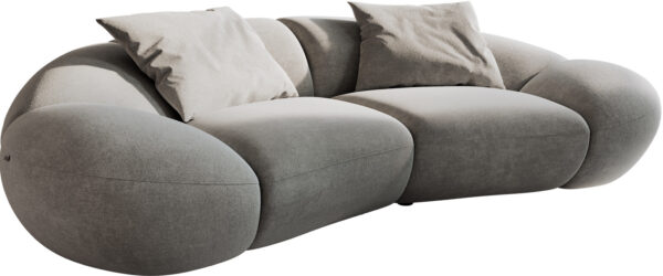 A jellegzetes félhold alak különleges kisugárzást kölcsönöz a kanapénak, és modern hangsúlyokat teremt a lakótérben. A tágas kárpitozás kellemes ülőérzetet nyújt, míg a kiváló minőségű kidolgozás és stabil szerkezet hosszú élettartamot garantál. A két mellékelt párna praktikus cipzárral van ellátva, így a huzatok szükség esetén könnyen levehetők.
