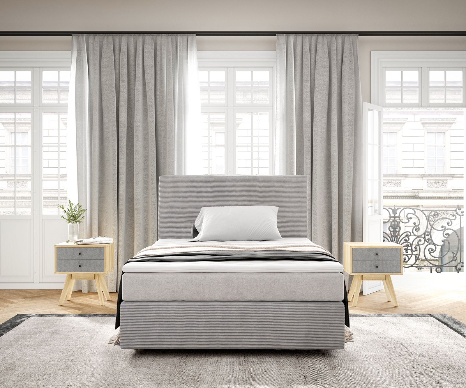 A boxspring ágyhoz egy elegáns alumínium megjelenésű lábkészlet jár. Ezeket tetszés szerint előre láthatóan vagy hátrább eltolva szerelheted fel, hogy lebegő hatást érj el az ágyon. A boxspring ágyak matrac nélkül is kaphatók, így más matracokkal is kombinálhatók. Így összeállíthatod azt az ágyat, amiről mindig is álmodtál. A puha párnázású háttámlának köszönhetően olvasós esték vagy hétvégi pihenések alkalmával is kényelmes órákat tölthetsz új, otthonos oázisodban. Az alig feltűnő ezüstszürke kord anyag kiemelkedően puha tapintást és visszafogott megjelenést biztosít.