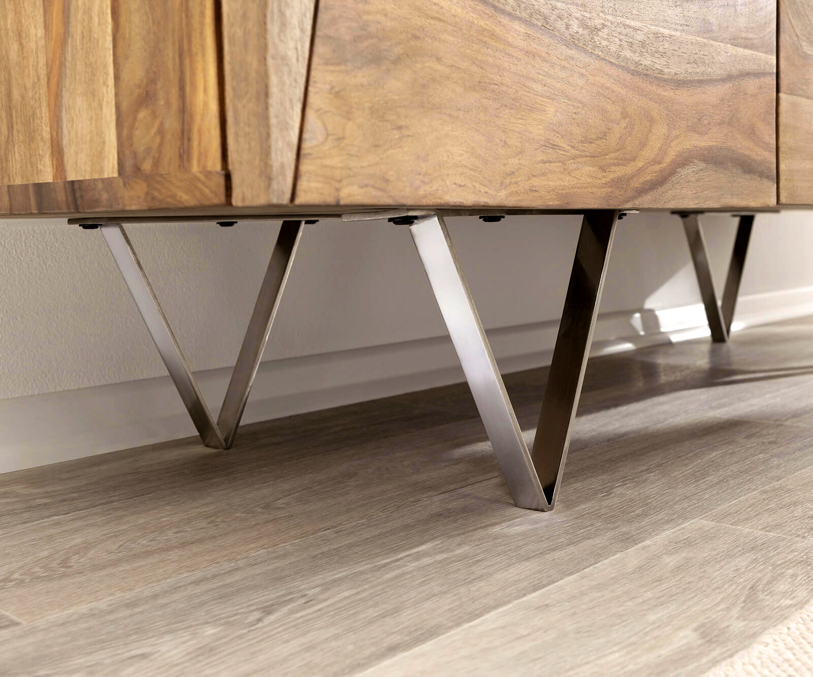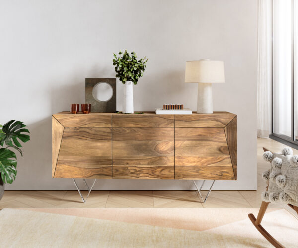 Ennek a tömörfa komódnak a korpusza finom rozsdamentes acél lábakon áll, amelyek időtlenül vonzó megjelenést és optimális stabilitást biztosítanak. A praktikus komód három ajtó mögött bőséges tárolóhelyet kínál, amely az egész lakásban sokféle tárgy tárolására alkalmas. Az étkezőben ez a vonzó bútordarab tálalószekrényként vagy büféként szolgálhat.