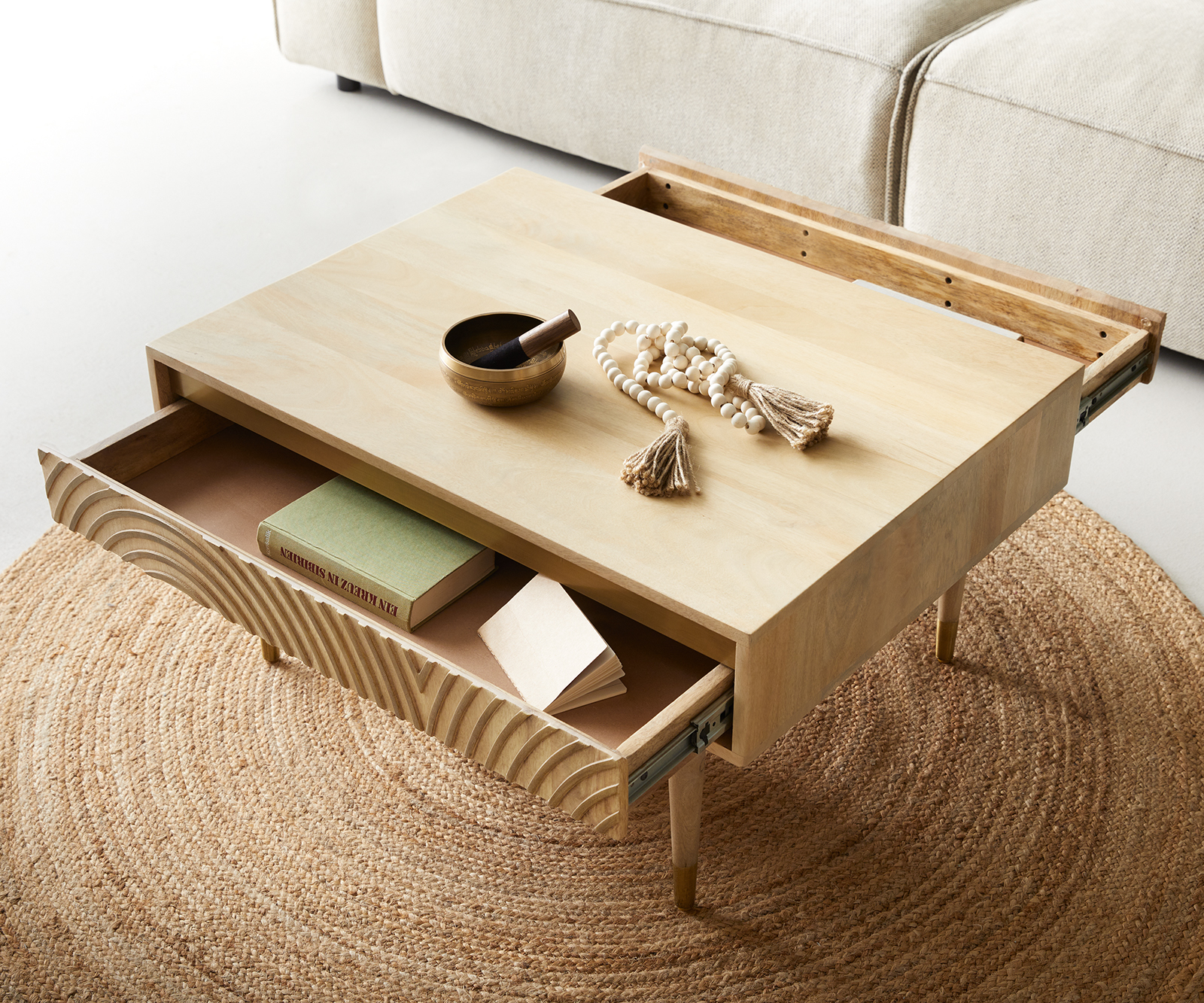 Négyzet alakú dohányzóasztal praktikus elemekkel. A stílusos etno mintázat a fiókokon divatos etno hangulatot kölcsönöz a helyiségnek. Természetes világos középbarna mangófa árnyalatban, enyhe szürkés-sárgás tónusokkal ragyog.