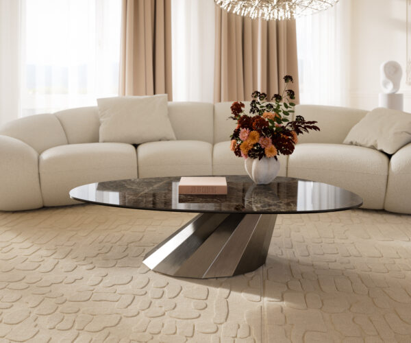 Dohányzóasztal Edge ovális 140×75 cm kerámia Laminam® Emperador extra lucido sötétbarna Parabi rozsdamentes acél szálcsiszolt
