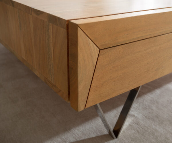 Az akác természetes megjelenésével a dohányzóasztal stílusos és lenyűgöző hatást kelt. A masszív fa egyedi, természetes erezete meghatározza a nappali dohányzóasztal karakteres, természetes kisugárzását. Kellemes kontrasztot alkotnak a vékony, V-alakú lábak, amelyek elegánsan csillogó, ezüst színű rozsdamentes acélból készültek. A kifinomult 3D hatású díszítések teszik teljessé a különleges design-t.