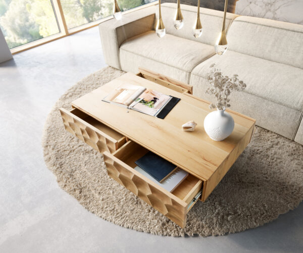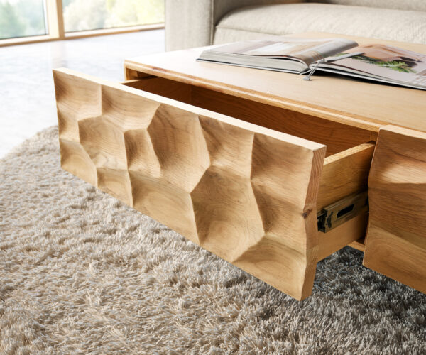 A Solu dohányzóasztal lélegzetelállító designban mutatkozik be, amelyet a levélsejtek elrendezésének szépsége ihletett. A feltűnő 3D előlap különösen kidolgozott domborított technikával készült. Ehhez extra erős, fenntartható módon termelt tölgyfa elemeket gondosan válogatnak, majd precíz marással egy lenyűgöző összképpé alakítanak. Egy első osztályú kézműves remekmű születik, amely nappalidat az otthonod valódi központjává teszi.
