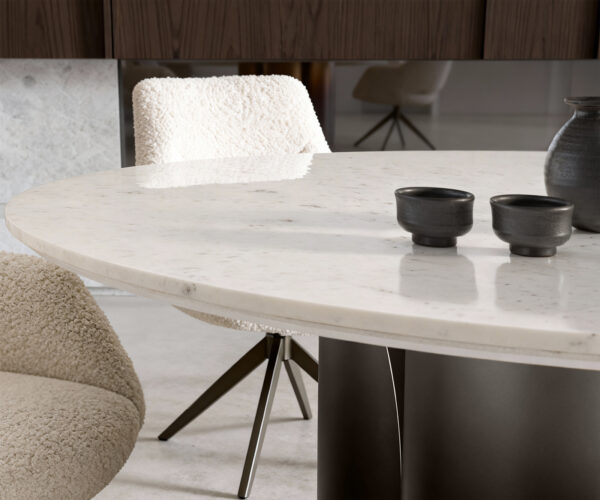 Világos, letisztult, magabiztos: az Adenza fehér színben a márvány könnyedségét ötvözi a fekete fém láb hűvös ragyogásával. A festés mélységet ad az alsó résznek, és kiemeli a kerek asztallap tiszta kontúrját. Egy asztal, amely strukturálja a tereket, ugyanakkor nyitottságot sugároz.