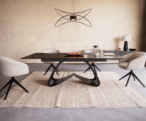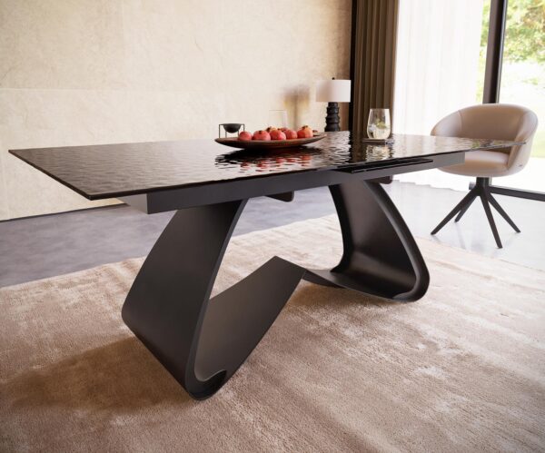 Az Edge asztal lába is lenyűgöz egyedi designjával és magas minőségével. A feltűnő W-alak gyönyörűen áramló hatást kelt, és elegáns könnyedséget ad az asztalnak. Porfestett fekete fémből készült, a design lábazat lélegzetelállító kontrasztot alkot az elegáns asztallappal, így az Edge asztal igazi műalkotássá válik otthonodban.