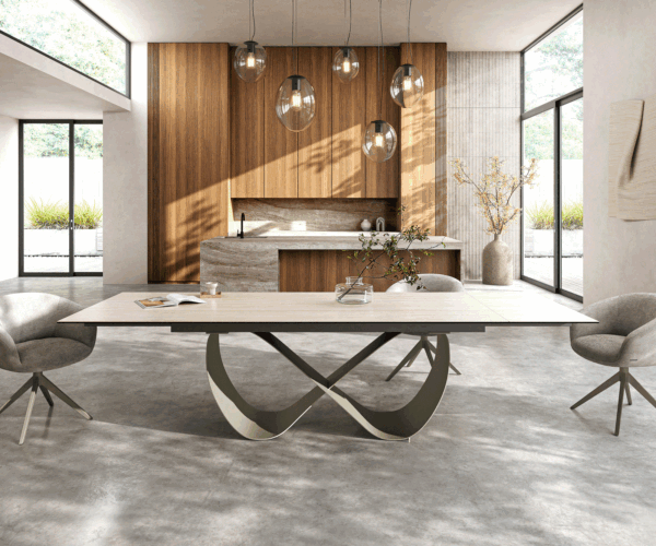 - Az asztallap egy folyamatos kerámialapból készül, és egyedi megjelenését a harmonikus összkép adja, még a kihúzható funkcióban is megszakítások vagy optikai fugák nélkül.