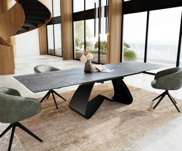 - Az asztallap egy darab folyamatos kerámialapból készül, amely egyedi megjelenést biztosít, még a kihúzható funkció használata esetén is megszakítások vagy vizuális illesztések nélkül.