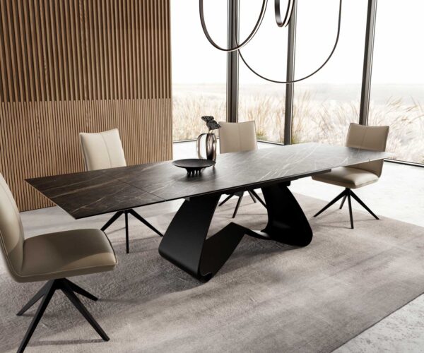 - Az asztallap egy darab folyamatos kerámialapból készül, amely egyedi megjelenést biztosít még a kihúzható funkció használata közben is, megszakítások vagy vizuális illesztések nélkül.