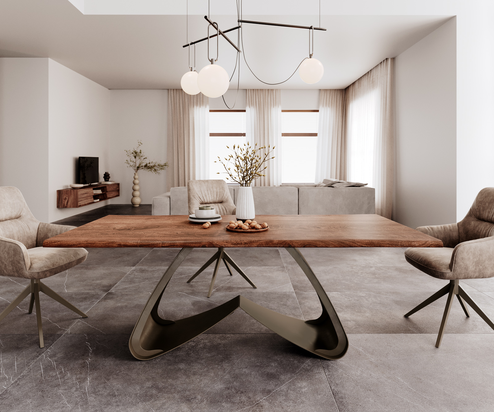 A gyönyörűen ívelt, elegáns W-alakú fém lábazat stabil tartást és tökéletes eleganciát kölcsönöz az asztalnak. Gondosan kezelték értékes pigmentekkel, amelyek a design lábazatot lágyan izgalmas titán effekt felülettel csillogtatják meg.