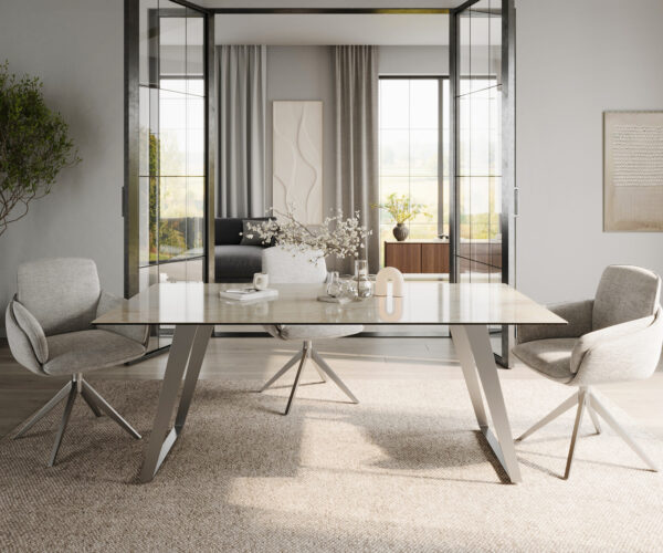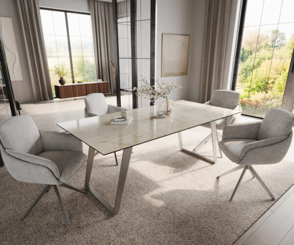 Ennek a különleges étkezőasztalnak a színvilága finom napsütést és elegáns pezsgőszíneket egyesít egy meleg, harmonikus kompozícióban, amely a kiváló minőségű kerámiát tökéletes eleganciával emeli ki. Gondosan egy darabból készült, első osztályú kerámiából, a finom színárnyalatok makulátlanul érvényesülnek, és rendkívüli mélységet kölcsönöznek a felületnek. A simán polírozott asztallap lenyűgöző módon tükrözi a fényt, kiemelve a színek csillogó játékát minden árnyalatában. Ezt az egyedi hatást a legmodernebb gyártástechnológiák teszik lehetővé, amelyek különleges mélységet és változó fényességi fokokat hoznak létre – szinte úgy, mintha a napsütés életre kelne a kerámiában. A tisztán vezetett asztallap él tökéletesen keretezi a lágy színátmenetet, és arra hívja fel a tekintetet, hogy újra és újra végigsuhanjon a felületen, felfedezve minden részlet szépségét.
