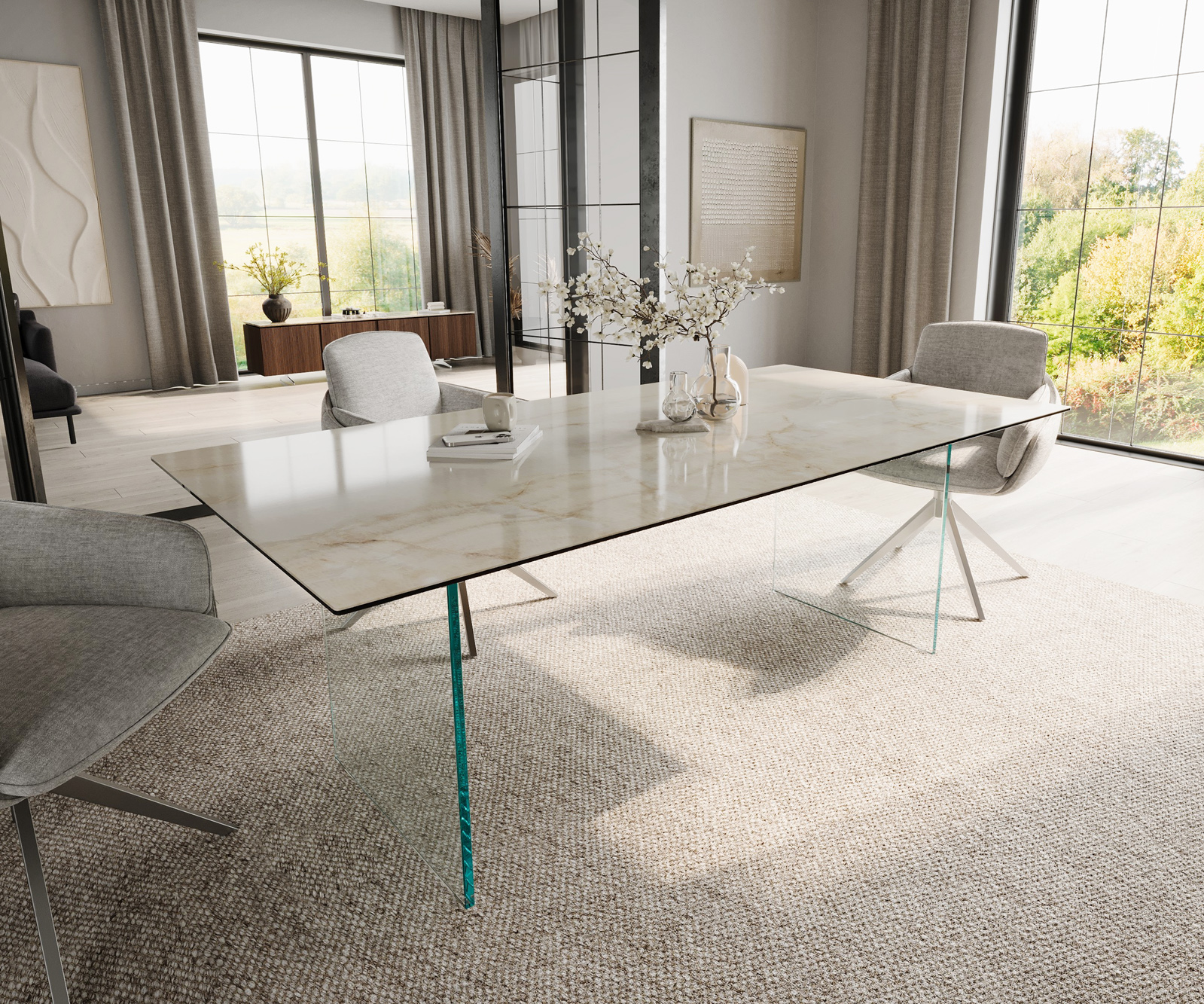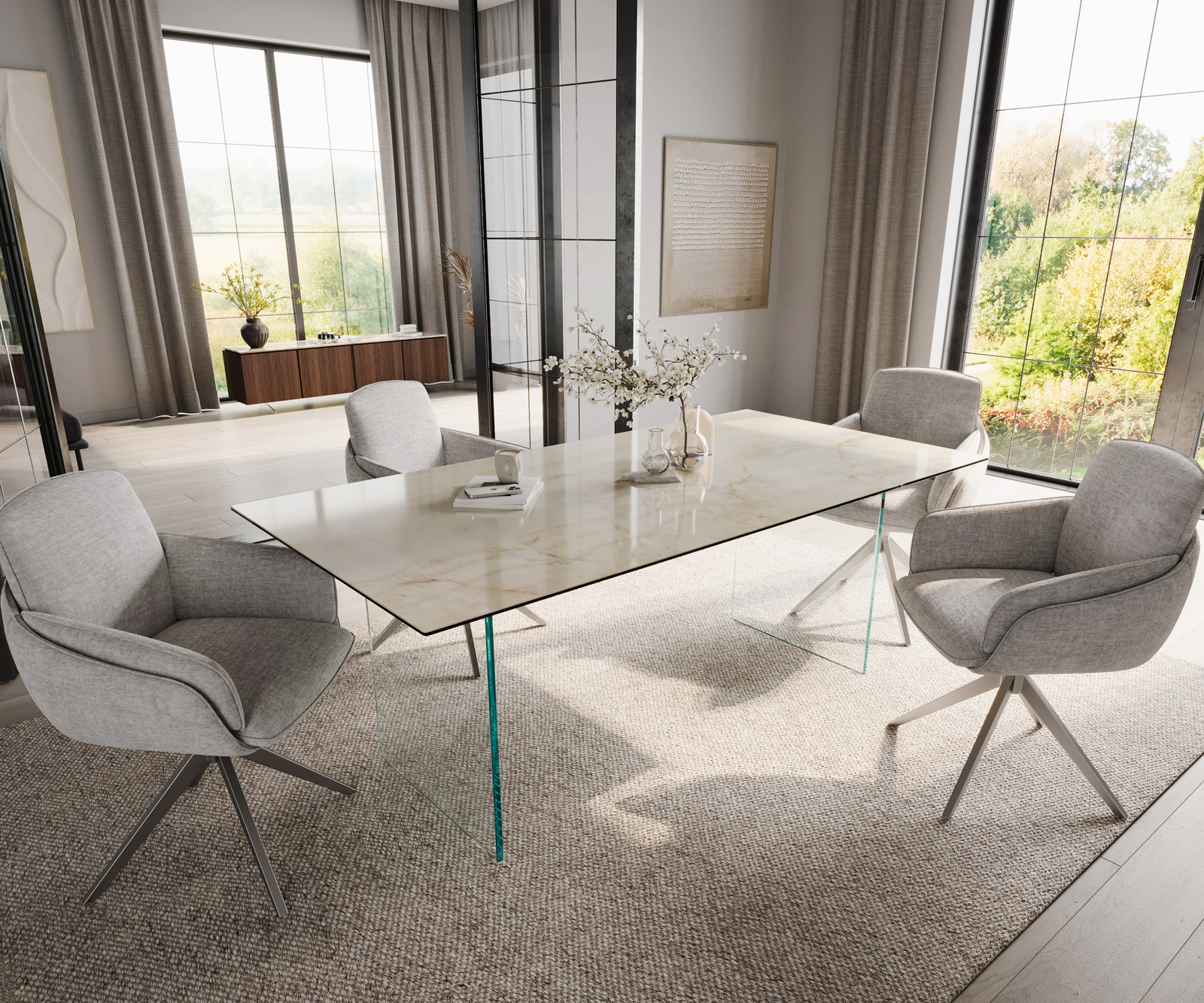 Ennek a különleges étkezőasztalnak a színvilága a finom napsütést és az elegáns pezsgőszín árnyalatait egyesíti egy meleg, harmonikus kompozícióban, amely tökéletes eleganciával emeli ki a kiváló minőségű kerámiát. Gondosan egyetlen darab első osztályú kerámiából készült, a finom színárnyalatok hibátlanul érvényesülnek, és rendkívüli mélységet kölcsönöznek a felületnek. A simára polírozott asztallap lenyűgöző módon tükrözi a fényt, és kiemeli a színek csillogó játékát minden árnyalatában. Ezt az egyedülálló hatást a legmodernebb gyártástechnológiák teszik lehetővé, amelyek különleges mélységet és változtatható fényességi fokokat hoznak létre – szinte úgy, mintha a napsütés életre kelne a kerámiában. A tisztán vezetett egyenes asztallapél tökéletesen keretezi a lágy színátmenetet, és arra hívja fel a tekintetet, hogy újra és újra végigsiklik a felületen, hogy minden részlet szépségét újra felfedezze.