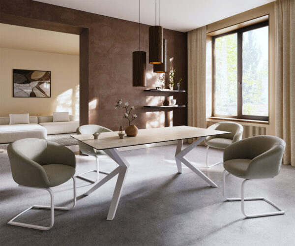 A kiváló minőségű, porfestett fém láb barátságos és időtálló fehér színben ragyog. A színvilág és a rendkívül kidolgozott design elegáns könnyedséget kölcsönöz az étkezőjének, kiemelve ennek a nemes étkezőasztalnak a szépségét és exkluzivitását.