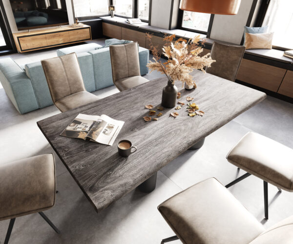 Különösen kemény akácfából készült Live-Edge étkezőasztal puha, ívelt, természetes élkialakításával és exkluzív, ezüstösen csillogó platinaszínével nyűgöz le. A masszív fa magas színvonalú kidolgozása és hangulatos designja ezt az étkezőasztalt extravagáns központi elemmé teszi az étkeződban. Minden Live-Edge asztal egy exkluzív egyedi darab, amely csodálkozó tekinteteket vonz, ugyanakkor harmonikusan illeszkedik számos berendezési stílushoz. A klasszikus, téglalap alakú asztallap kiváló helykomfortot biztosít, és különösen magas minőségének köszönhetően a mindennapi igénybevételnek is jól ellenáll.