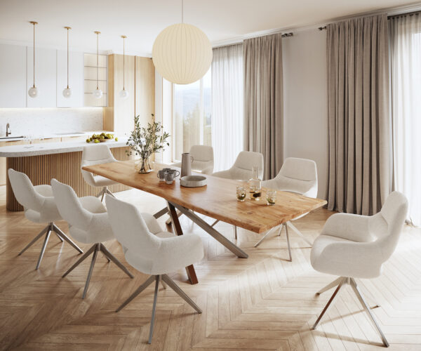 A Live-Edge étkezőasztal egyedi asztallapjával lenyűgöz, amely elegánsan hullámos, természetes élű akácfa masszív és különösen ellenálló anyagából készült. A masszív fa természetes színe gyönyörűen kiemeli minden darab egyedi jellemzőit, és kifinomultan hangsúlyozza az akác finom erezetét. Minden Live-Edge asztal abszolút egyedi darab, ugyanakkor klasszikus, téglalap alakú asztallapjának és természetes színvilágának köszönhetően kiválóan illeszkedik a legkülönbözőbb lakberendezési stílusokhoz, és meghitt, teljesen egyéni hangulatot teremt.