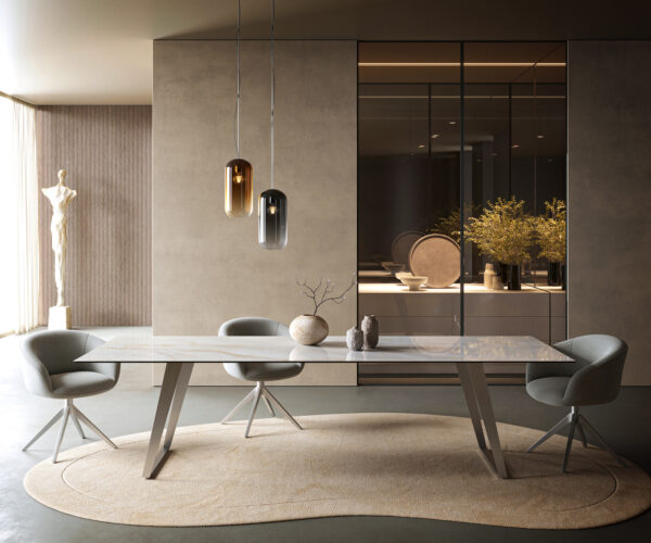- Az asztallap egy darab folyamatos kerámialapból készül, amely egy harmonikus összképben egyediséget kap.