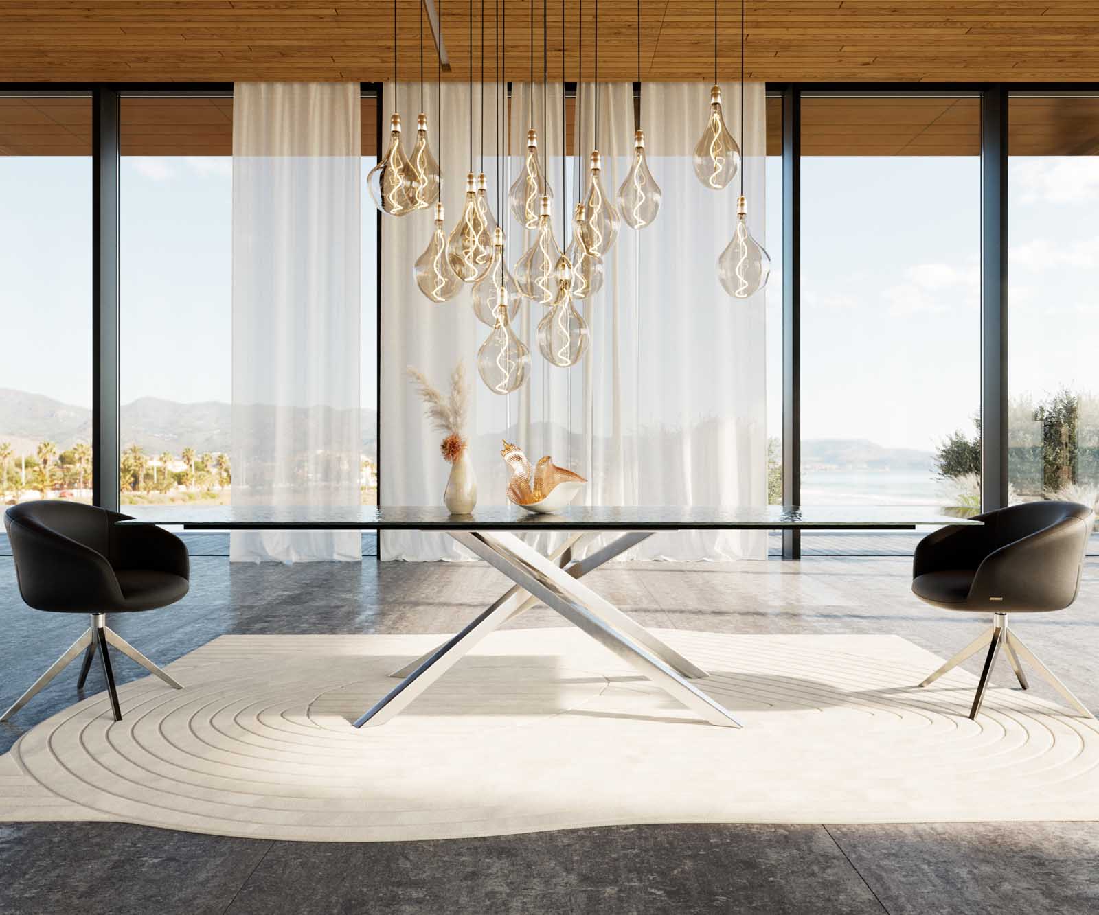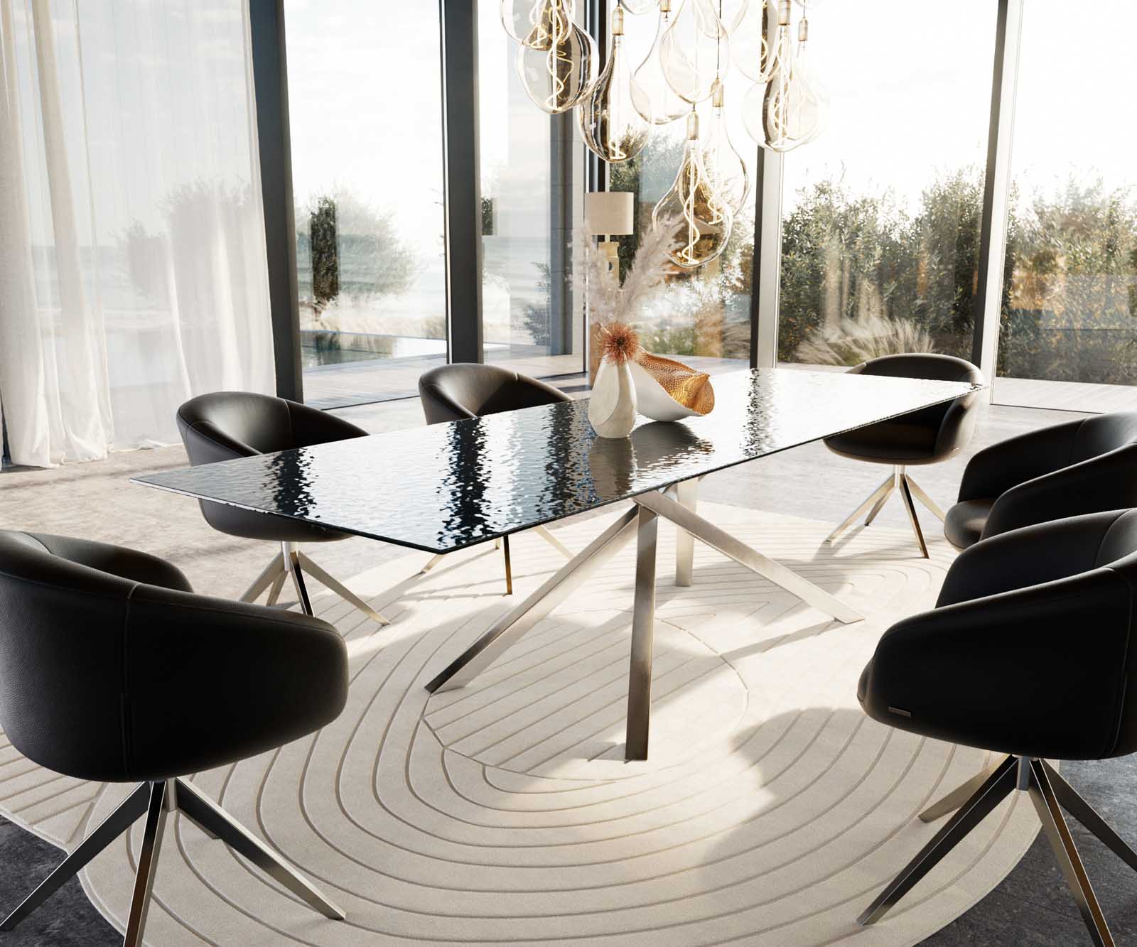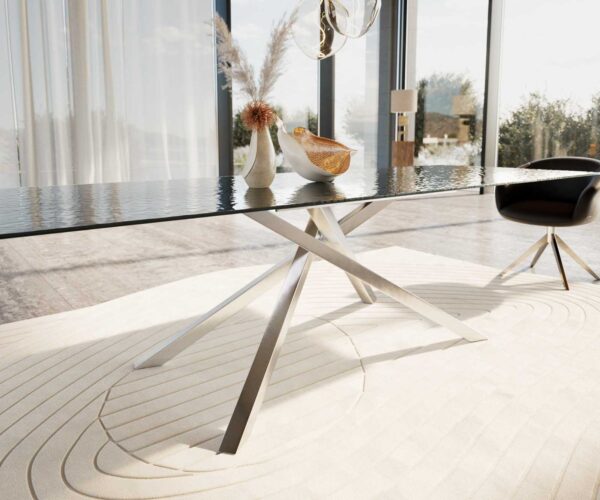 A kiváló minőségű rozsdamentes acélból készült ezüstszínű keret kereszt alakjának és egyenes, téglalap alakú lábainak köszönhetően különösen elegánsnak, ugyanakkor könnyednek és lendületesnek hat. A keret kiválóan megmunkált anyaga harmonizál az asztallappal, így az Edge asztalok modern és időtálló értelmezését képviselik.