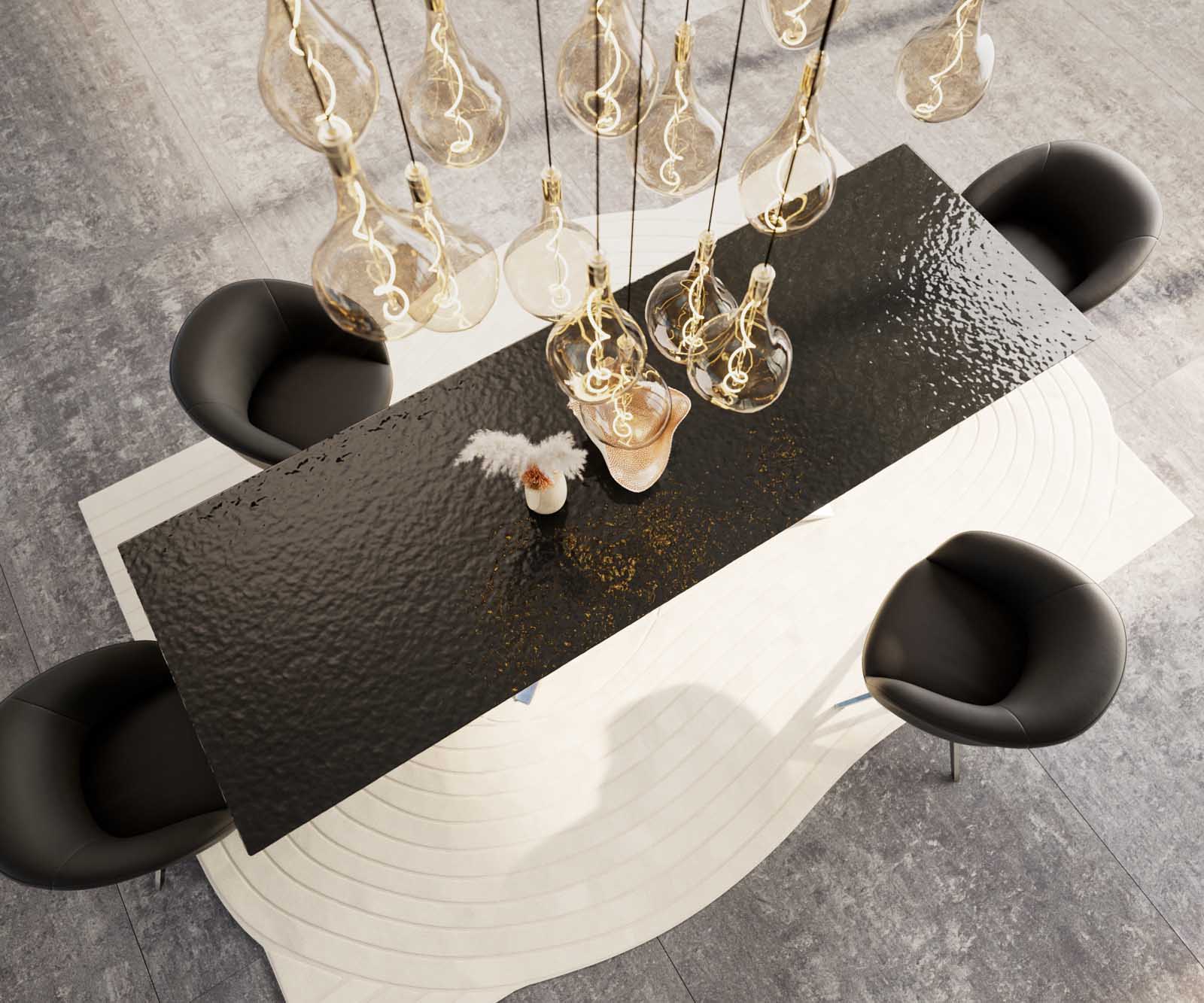 Ez az Edge asztal valódi stílusnyilatkozat! Kiváló minőségű olvasztott üvegből készült asztallapja nemcsak különösen kemény és tartós, hanem intenzív kifejezőerejével is egyedülálló. Az igényes gyártási folyamat során egy Float üveglapot akár 800 fokra hevítünk, így az üveglap megpuhul, és egy speciális bélyeg segítségével különleges 3D-relief díszítéssel látják el. A lehűlés után a most edzett olvasztott üveget az alsó oldalon fekete színű lakkréteggel vonják be, amely különösen elegáns megjelenést biztosít. Az Edge olvasztott üveg asztallal egy páratlan bútordarab kerül az otthonodba, amely kinézetével, egyedi tapintásával és foltállóságával azonnal magával ragad.
