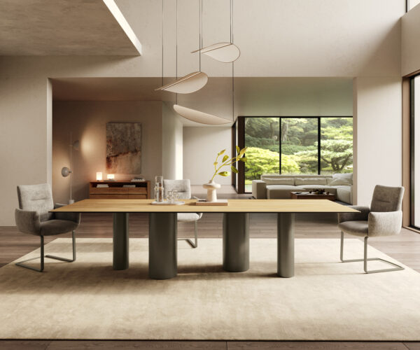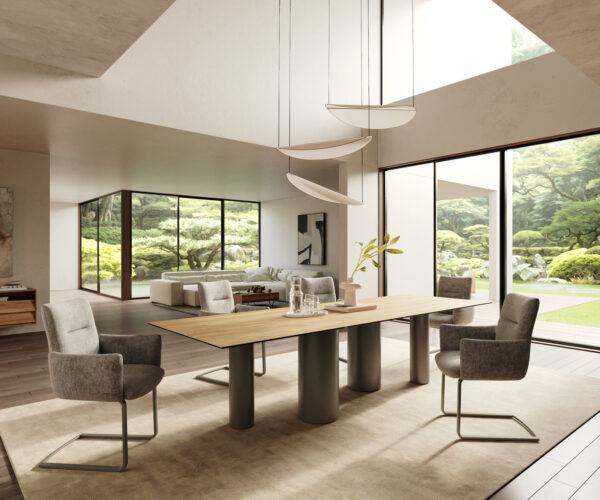 - Az asztallap egyetlen, folyamatos kerámialapból készül, amely harmonikus egységet alkot, egyedülállóvá téve azt.