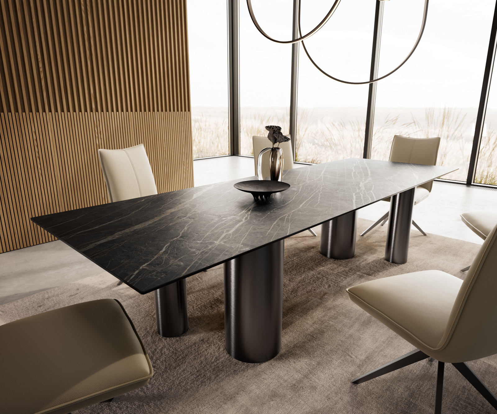 Matt fekete árnyalatban az egyedülálló rozsdamentes acél asztalláb kiemeli az asztallap szépségét, és négy, két különböző átmérőjű lábával változatos játékot teremt a stabilitás és a látszólagos mozgás között.