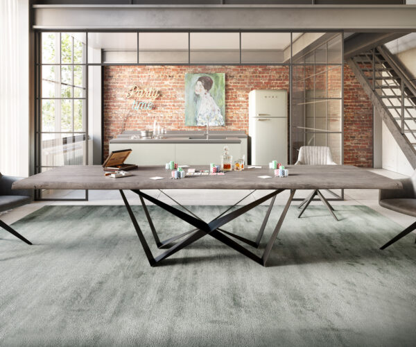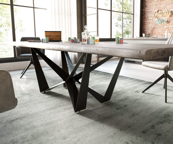 Az Edge asztal exkluzív, lapos fém Spider lábazattal rendelkezik. A fekete porszórt bevonat különösen karc- és ütésállóvá teszi azt. Progresszív designjával a lábazat izgalmas ellenpontot képez a masszív asztallapnak, és mesterien támogatja a hangulatos, exkluzív összhatást lenyűgöző intenzitással.