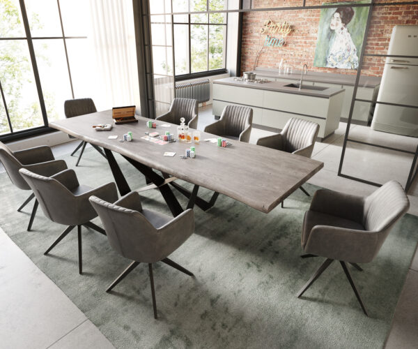 Különösen kemény akácfából készült Live-Edge étkezőasztal lágyan ívelt, természetes faéleivel és exkluzív, ezüstösen csillogó platinaszínével nyűgöz le. A masszív fa magas színvonalú kidolgozása és hangulatos designja ezt az étkezőasztalt extravagáns központi elemmé teszi az étkeződban. Minden Live-Edge asztal egy különleges egyedi darab, amely csodálatot kelt, ugyanakkor harmonikusan illeszkedik számos berendezési stílushoz. A klasszikus, téglalap alakú asztallap kiváló helykomfortot biztosít, és kiemelkedő minőségének köszönhetően a mindennapi igénybevételt különösen jól bírja.