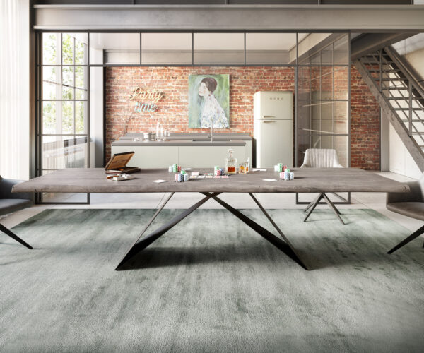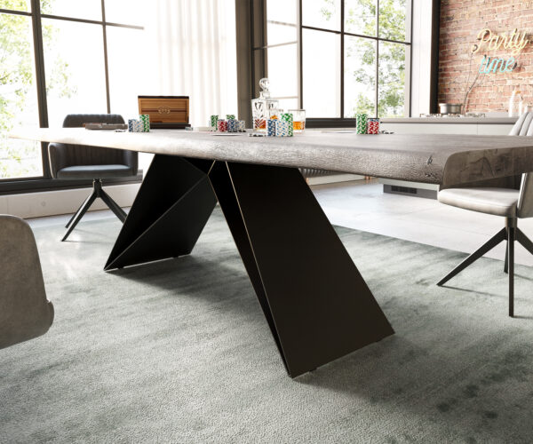 Az impozáns, lélegzetelállító asztalláb dizájn futurisztikus jelleget kölcsönöz az étkezőasztalnak, amely erőteljes kontrasztot alkot az asztallappal, így fantasztikus összhatást teremt. A lapos „V” alakú lábazat rendkívül igényesen, porfestett fémből készült. A matt fekete színárnyalat visszahúzódik az asztallap élénk pompája mögött, mégis extravagáns kialakításának és kiemelkedő ellenálló képességének köszönhetően egy pillanatra sem veszít kreatív, rendkívül szép drámaiságából.