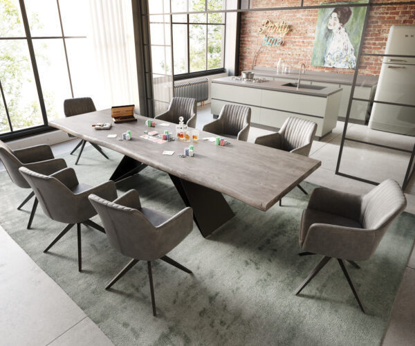 Különösen kemény akácfából készült Live-Edge étkezőasztal puha ívű, természetes faéleivel és exkluzív, ezüstösen csillogó platinaszínével nyűgöz le. A masszív fa magas színvonalú kidolgozása és hangulatos designja ezt az étkezőasztalt extravagáns központi elemmé teszi az étkezőhelyiségben. Minden Live-Edge asztal egy különleges egyedi darab, amely csodálatot kelt, ugyanakkor harmonikusan illeszkedik számos berendezési stílushoz. A klasszikus, téglalap alakú asztallap kiváló helykomfortot biztosít, és különösen magas minőségének köszönhetően a mindennapi használat során is kitűnően ellenáll.