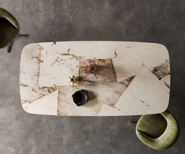 - Az asztallap egyetlen, folyamatos kerámialapból készül, amely egy harmonikus egységet alkot, egyediséget biztosítva.