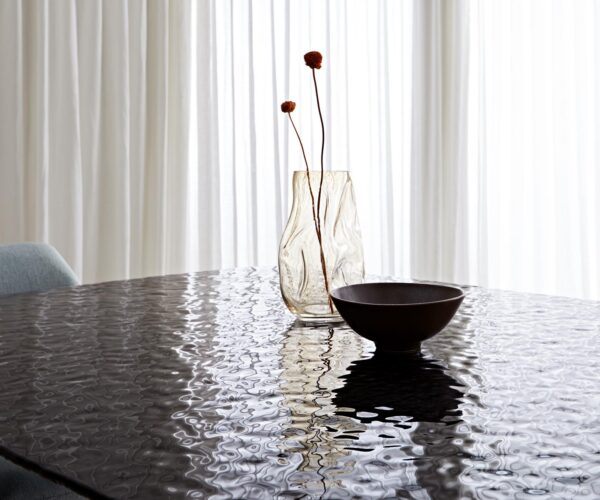 Exkluzív olvasztott üveg, amely egy különleges hajóformába ágyazva teszi az Edge étkezőasztalt a valódi design művészet gyönyörű példájává. Az asztallaphoz a float üveget akár 800 fokra hevítik, majd gondosan bélyegzővel dolgozzák meg. A domborítások lenyűgöző 3D hatást és tapintást eredményeznek, amelyek finoman játszanak az ujjaid hegyével. Az asztallap alsó oldalát gondosan fekete színnel festették le. Ez az asztalnak figyelemfelkeltő, modern megjelenést kölcsönöz, amely végtelenül stílusos légkört teremt az étkezőhelyiségben.