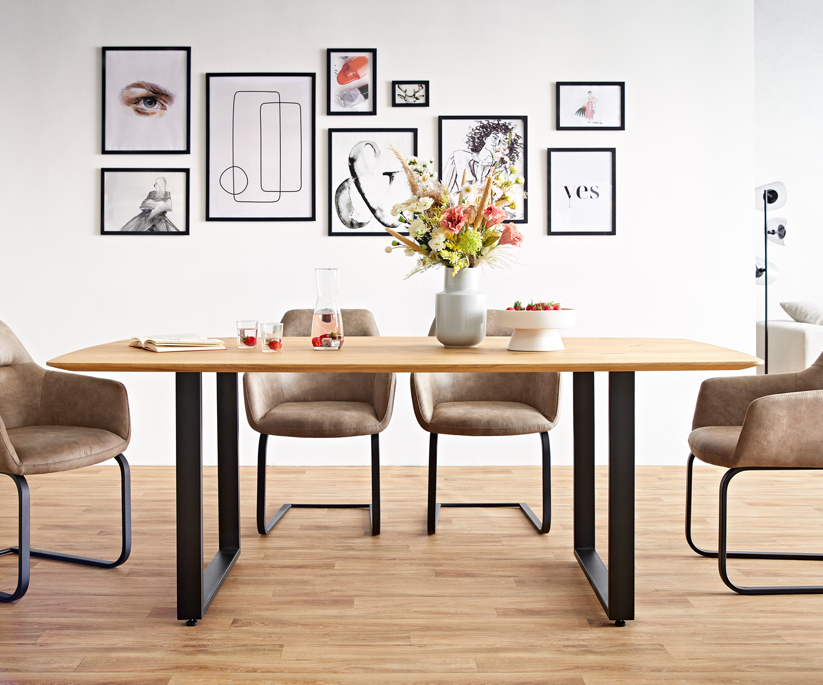 Az egyedi tölgyfa elegáns, enyhén aranyos árnyalatával találkozik az Edge étkezőasztal klasszikus asztallap dizájnjával, amely svájci éllel különleges látványossággá válik az étkezőben. A svájci él azt jelenti, hogy az asztallap széle lefelé elvékonyodik. Ez különösen könnyed, szinte finom megjelenést kölcsönöz a masszív tölgyfa lapnak, és hangulatos, friss légkört teremt.