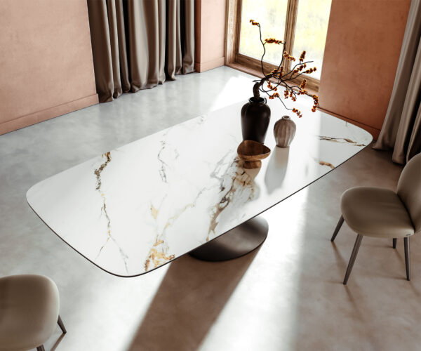 Lélegzetelállító étkezőasztal – Edge Calacatta Luxe kerámiából, hajóformában
