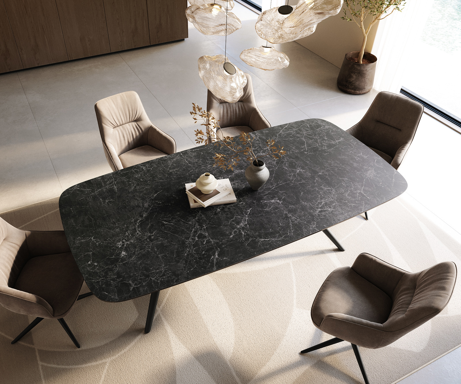 Az Edge étkezőasztal valódi Laminam® kerámiából Nero Greco antracit színben – elegáns hajóformában