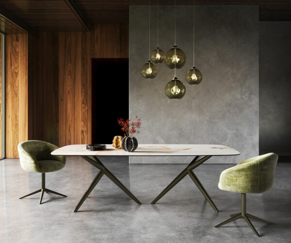 A lábazat további kiemelt eleme az étkezőasztalnak. A dinamikus design finomnak hat, ügyesen vezeti a tekintetet az asztallap felé, így az elegáns középpontba kerül. Egy gondos kezelésnek köszönhetően értékes pigmentekkel a magas minőségű fém egyedülálló titán effekt finishben csillog, amely további lenyűgöző árnyalatokat ad a sikeres megjelenéshez.