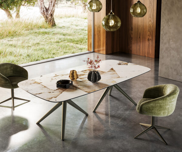 Az Edge ünnepli a kivételes design iránti szenvedélyt, amely egyedülálló megjelenést kölcsönöz az étkezőjében. Erőteljes formák egyesülnek egy stílusos, extravaganciával és lenyűgöző szépséggel teli szimbiózisban. Elegáns, meleg barna és fehér árnyalatokat finom, folyékony arany erezet díszít, amely extrovertált és egyben titokzatos aurát kölcsönöz az étkezőasztalnak. Az asztallap mestermunkaként készült egy darab kiváló minőségű kerámiából. A erezet megszakítás vagy illesztés nélkül fut végig, így lenyűgöző módon fejtheti ki hatását. Finoman strukturált felület és a különleges hajóforma tökéletesíti az elegáns designt. Egy olyan étkezőhöz, amely tele van hangulattal és egyedi ragyogással.