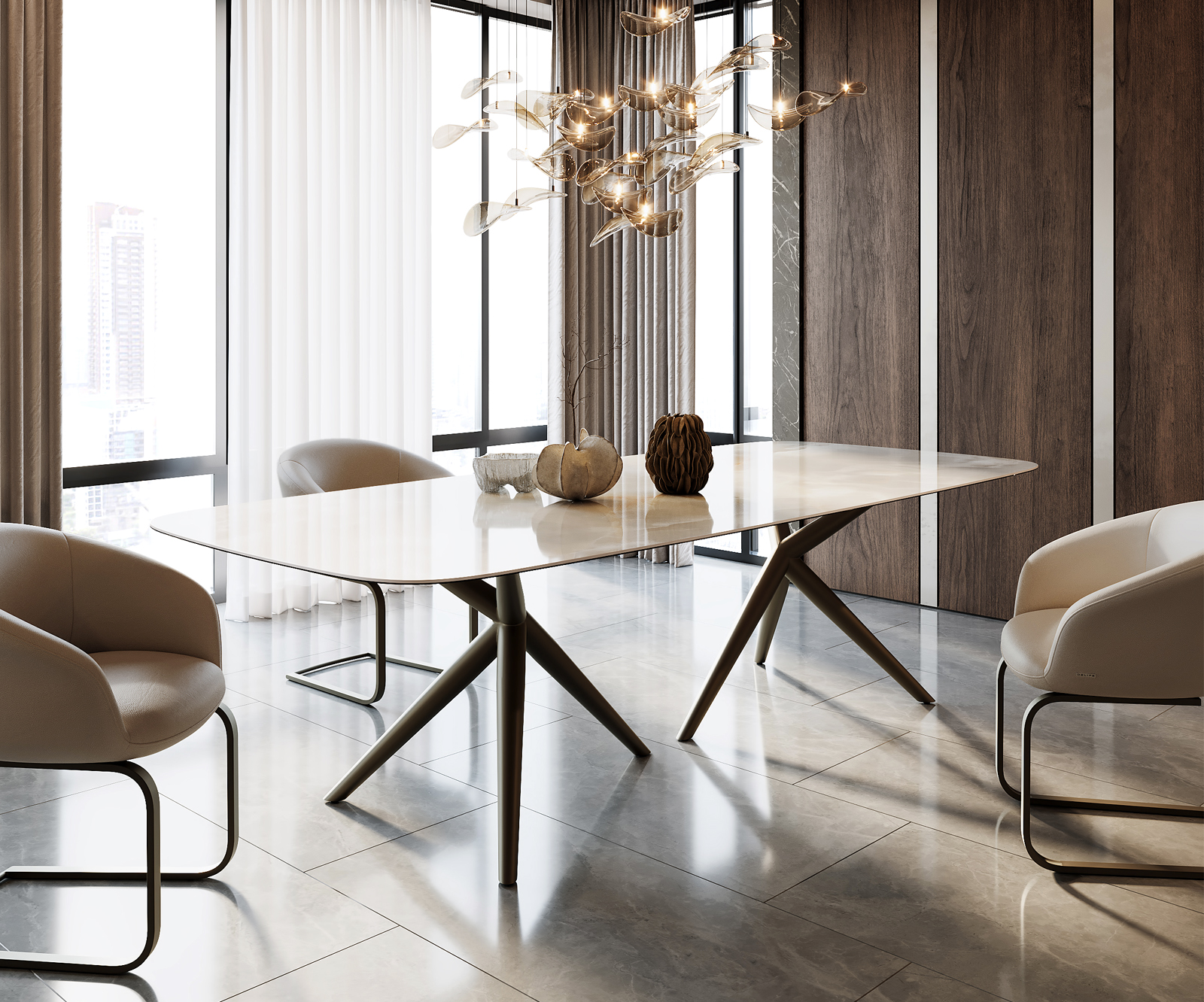 - Az asztallap egy darabból készült kerámialapból áll, amely egységes összhatást és egyediséget biztosít.