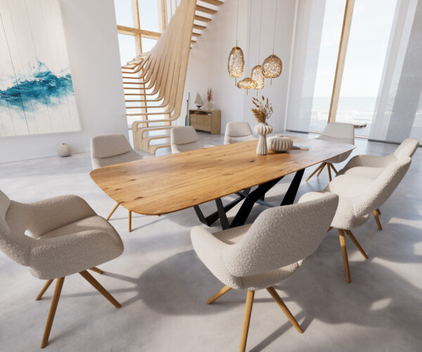 Egyedi tölgyfa, elegáns, enyhén aranyos csillogású árnyalatával találkozik az Edge étkezőasztal klasszikus asztallap dizájnjával, amely svájci él kialakításának köszönhetően lenyűgöző látványosság lesz az étkeződban. A svájci él alatt az asztallap élének lefelé való elvékonyodását értjük. Ez különösen könnyed, szinte finom megjelenést kölcsönöz a masszív tölgyfa lapnak, és hangulatos, friss légkört teremt.