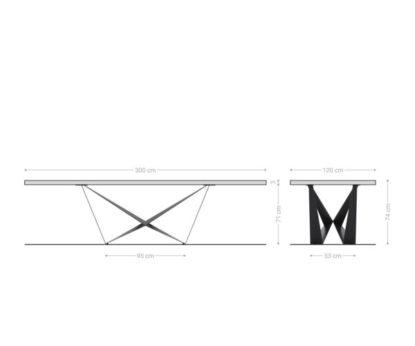 Étkezőasztal Edge hajóformájú 300x120x2,5-3 tölgy természetes pókláb laposacél fekete svájci él