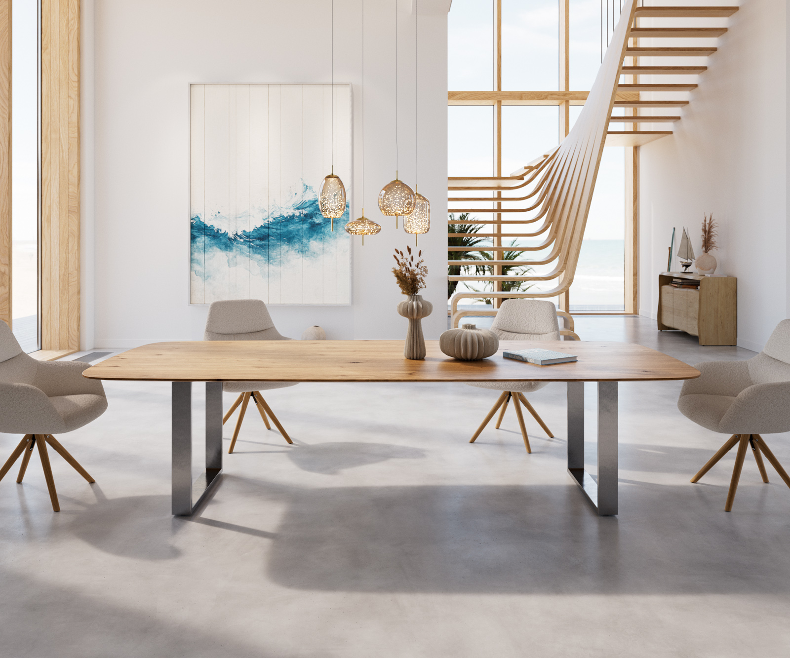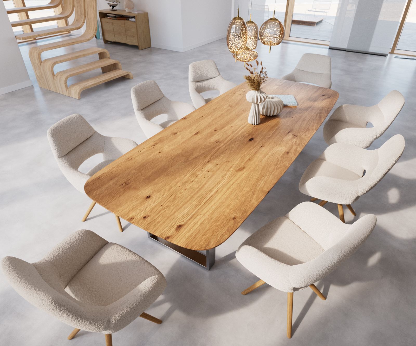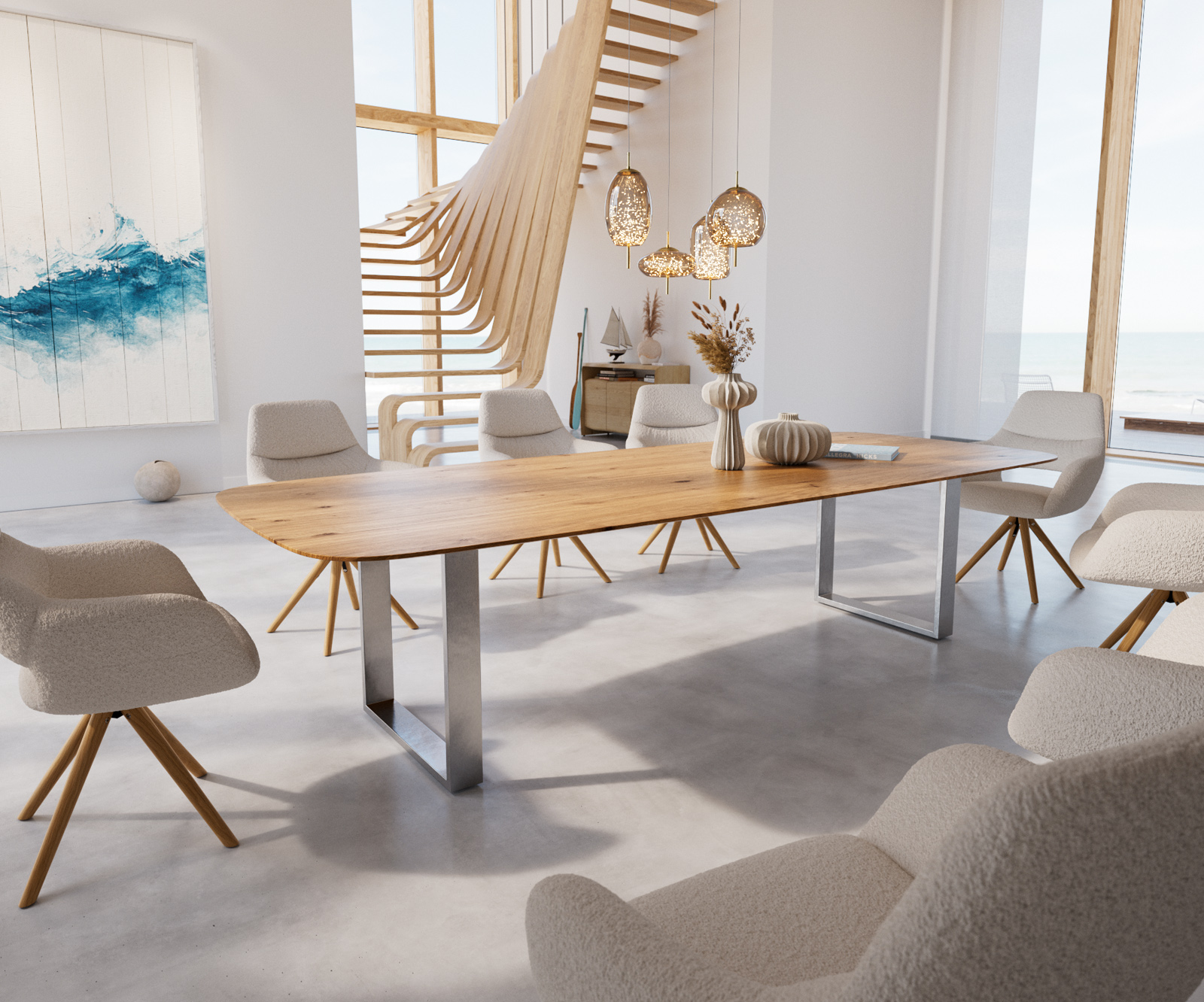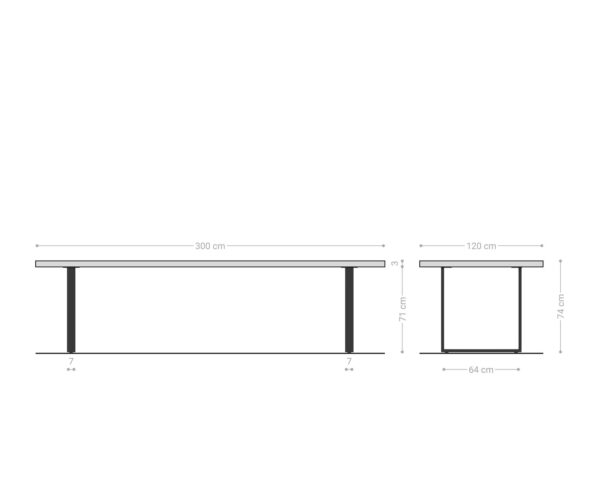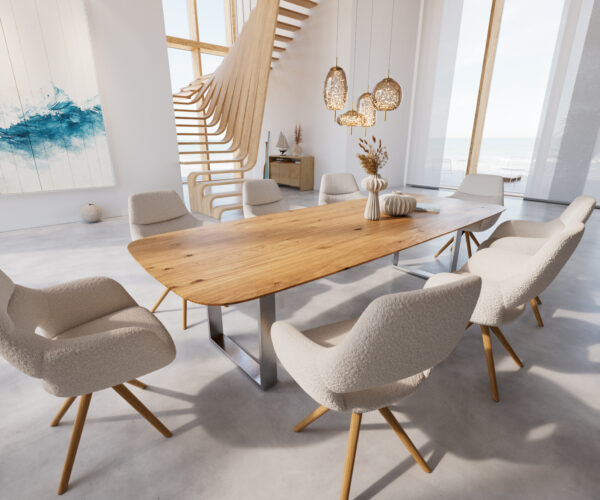 Étkezőasztal Edge hajóformájú 300x120x2,5-3 tölgy természetes rozsdamentes acél keskeny svájci él