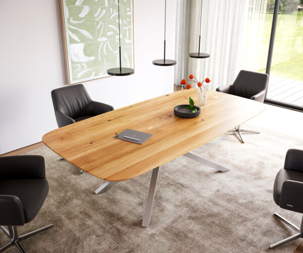 Étkezőasztal Edge hajóformás 240x120x2,5-3 tölgy természetes kereszt láb téglalap rozsdamentes acél svájci él