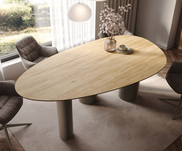 Étkezőasztal Edge ovális 220x120 kerámia Laminam® sabbia tölgyszínű Pilier fém titán effekt felület
