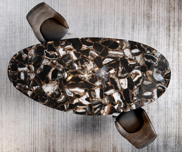A lélegzetelállító szerkezetű kriptokristályos kőzet inspirálta ezt az egyedi étkezőasztalt. Hullámok, fodrok és vonalak formálódnak egy rendkívüli felületi megjelenéssé, amely arra hívja a tekintetet, hogy felfedezze a titokzatosságot. A végtelen fekete árnyalatok tobzódása egyedülállóan elegáns és hangulatos légkört kölcsönöz minden térnek. Egy darabból, kiváló minőségű kerámiából mesterműként készült ez az asztal organikusan ovális formájával tökéletes hibátlanságot ér el, megszakítások vagy illesztések nélkül a erezet és színátmenet tekintetében. A tükörfényű asztallap ügyesen ragadja meg a fényt és az árnyékot. Olyan atmoszférát teremt, amely feltétel nélkül megragadja az összes érzékedet.