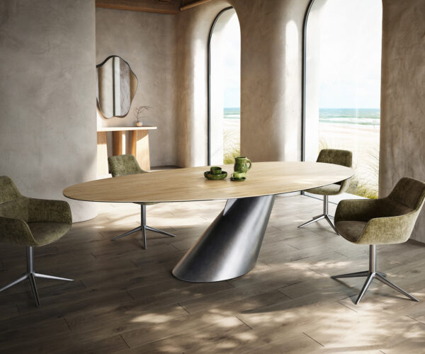 Ezzel az Edge étkezőasztallal átalakíthatja étkezőjét, és kellemes, szép hangulatot varázsolhat neki. Az ovális asztallap valódi, Olaszországból származó Laminam® kerámiából készült. Világszerte kiváló hírnévnek örvend, és szakértők dicsérik csodálatos könnyű tisztíthatósága, valamint értékes színek és anyagok mesteri utánzásai miatt. A mestermunka szépsége leginkább ezen elegáns lapon mutatkozik meg. A finom színárnyalatok, amelyek nemes tölgyfára emlékeztetnek, a híres velencei lagúna egyedi homokszíneiből merítenek ihletet, és nyugodt, lenyűgözően természetes szépséget sugároznak. A sima felület olyan gondosan kezelt, hogy finomnak, szinte puhanak érzed. Ilyen hívogató, érzékeny és jótékony hatású étkezőasztallal még soha nem találkoztál.
